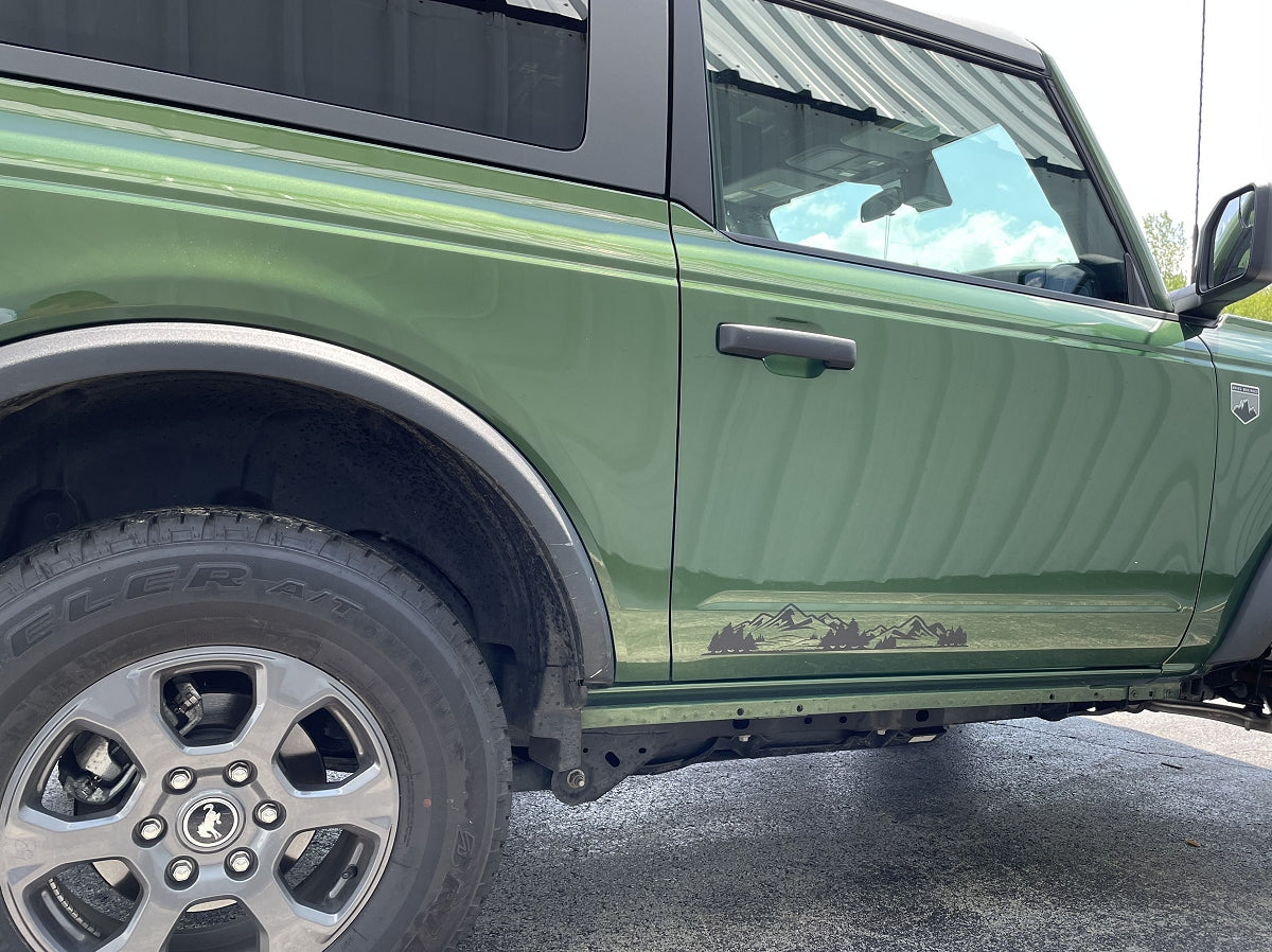 Show off your Bronco with our vinyl rocker door stripes. This stripe kit is available with the mountain scene as shown in the photo.  All of our stripe kits use Hexis vinyl and are applied dry (far superior to the wet application process). Our vinyl stripe kits come with a full 7 year warranty against cracking, fading or yellowing.