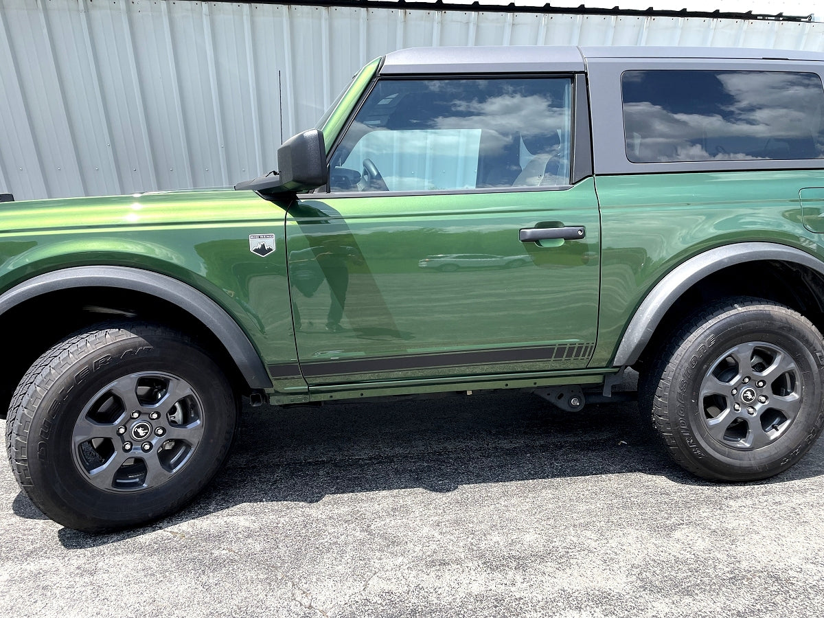Show off your Bronco with our vinyl rocker door stripes. This stripe kit is available with the hash marks cut out as shown in the photo.  All of our stripe kits use Hexis vinyl and are applied dry (far superior to the wet application process). Our vinyl stripe kits come with a full 7 year warranty against cracking, fading or yellowing.