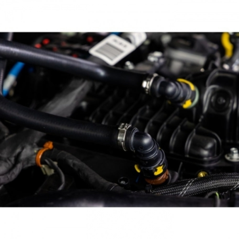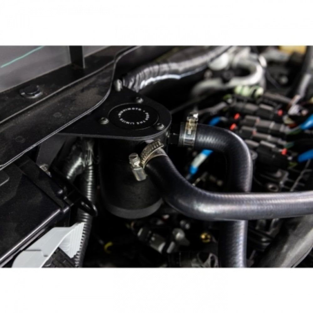 FEATURES: Direct fit for 2021+ Ford Bronco with 2.7L EcoBoost Pre-installed factory-style quick-disconnect fittings for clean installation Direct-fit bracket mounts the catch can away from engine vibration Sturdy 2.5mm-thick steel brackets withstand rough roads and off-road abuse Helps prevent fuel dilution and preserve its octane rating Catch can captures blow-by, preventing it from fouling the engine oil Includes molded hoses specifically designed for the 2.7L EcoBoost PCV system Internal components can be easily cleaned and reused for a lifetime of service Patent #US D884,760 S Mishimoto Lifetime Warranty DESCRIPTION The legendary Ford Bronco has returned, and under the retro-styled hood lies a new legend: the 2.7L EcoBoost. The 2.7L EcoBoost has been powering Fords for nearly a decade and has become one of the most respected truck engines available. The second generation 2.7L features both port and direct injection for efficiency throughout the RPM range. While the added port injection helps clean the intake valves, it doesn't protect the rest of your engine from the effects of blow-by. As blow-by flows through your intake, it coats components like sensors and your intercooler in a sludge of oil, carbon, and fuel, reducing their ability to function. Blow-by can also reduce the effectiveness of your engine oil. The factory air-oil-separator drains blow-by back into the oil pan, which is great for the environment, but the fuel and water in blow-by can thin your engine oil and reduce its effectiveness. Finally, any blow-by that does make its way back into the cylinder can reduce the effective octane of your fuel and, for a high-strung turbocharged engine like the 2.7L EcoBoost, lower octane means less power. The solution to all of those issues is to capture the blow-by and keep it out of the engine with a Mishimoto catch can. Our direct-fit baffled oil catch can kit for the 2021+ Ford Bronco 2.7L EcoBoost uses custom-molded hoses to intercept blow-by before it enters the intake and captures it to be recycled at your next oil change. Our catch can features an internal baffle and air turbulators that help condense oil, fuel, and water vapor from the blow-by, as well as a 50-micron sintered bronze filter that captures carbon particles. Our catch can is mounted away from engine vibration with a sturdy 2.5mm-thick steel bracket and our molded hoses include Ford-specific quick-disconnect fittings for an easy and clean install. Like all our Ford Bronco products, this catch can kit is backed by our Mishimoto Lifetime Warranty for a lifetime of clean running. PURCHASE INCLUDES (1) Direct-Fit Mounting Bracket (1) 3 fl. Oz. Black, Anodized 6061 Aluminum Catch Can (2) CNC-Machined Aluminum Barbed Fittings (2) Direct-Fit Hoses w/ Pre-Installed Quick-Disconnect Fittings (2) Worm Gear Clamps (3) Zip Ties Mounting Hardware Mishimoto Lifetime Warranty NOTES After installation, Mishimoto recommends checking the contents of the baffled catch can every 1,000 miles until a baseline is established. Oil blow-by accumulation will vary with ambient temperatures and driving conditions. It is important that the contents of the can do not rise above the internal baffle.