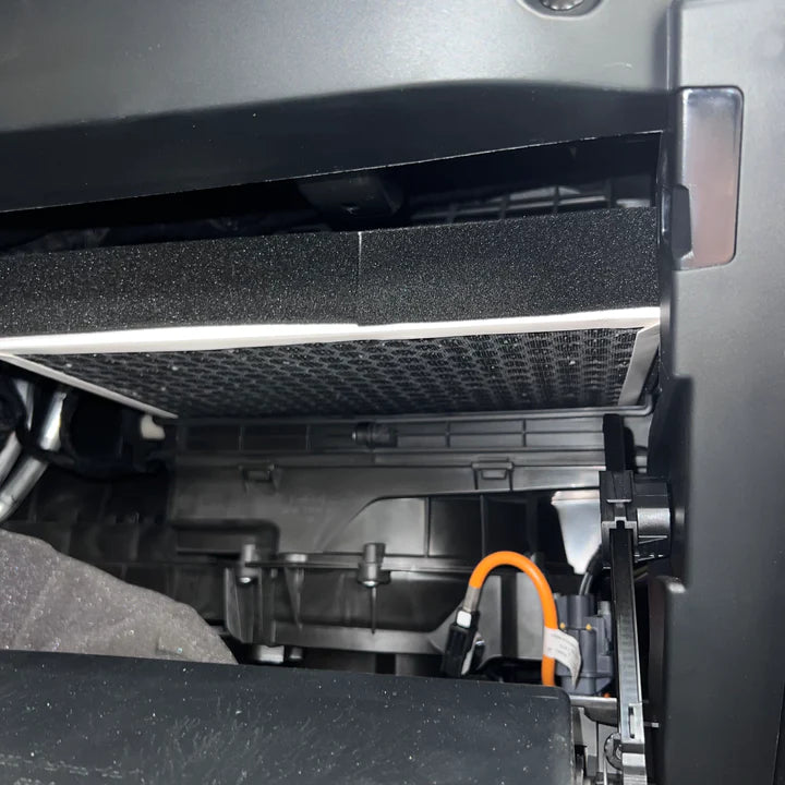 Installation of the Cabin Air Filter is a straightforward process that even those with minimal technical expertise can manage with ease. Begin by locating the OEM Filter, typically situated behind the glovebox. Remove the existing OEM filter and proceed to adhere to the guidance outlined in the provided evaporator and heater foam cleaner instructions. Following this, insert the new HEPA filter, ensuring that you align it in the direction of flow as clearly depicted in the accompanying images. Carefully slide the new filter into place, and you're good to go. It's worth noting that due to the enhanced filtration capabilities, there may be a slight reduction in airflow once the filter is installed. As a maintenance recommendation, it is advisable to replace the filter at intervals of 15,000-20,000 miles, or even more frequently if your driving habits frequently involve off-road terrains.