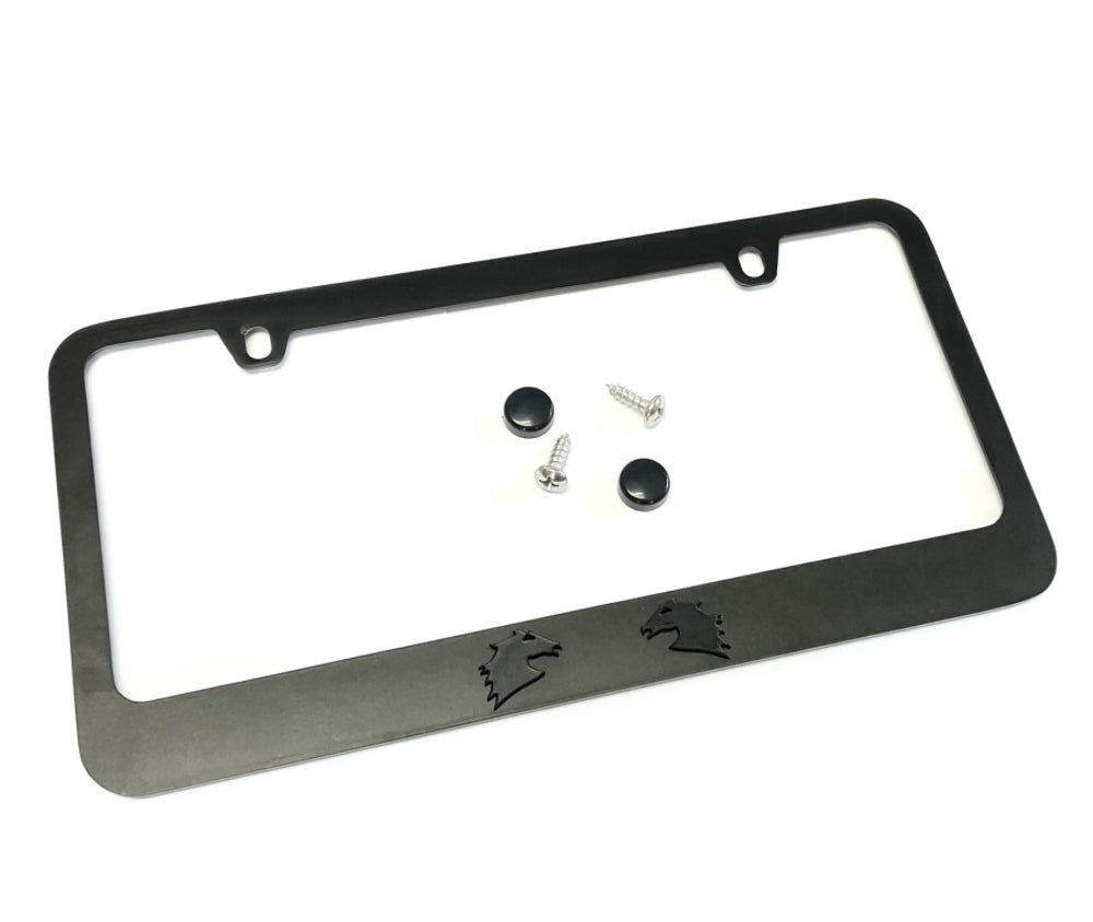 Add some tyle to your Ford Bronco with our Black Stealth License Plate Frame. This frame comes with two Bronco heads as shown. Our license plate frame is powder coated black steel and includes a set of screws, screw covers and caps.